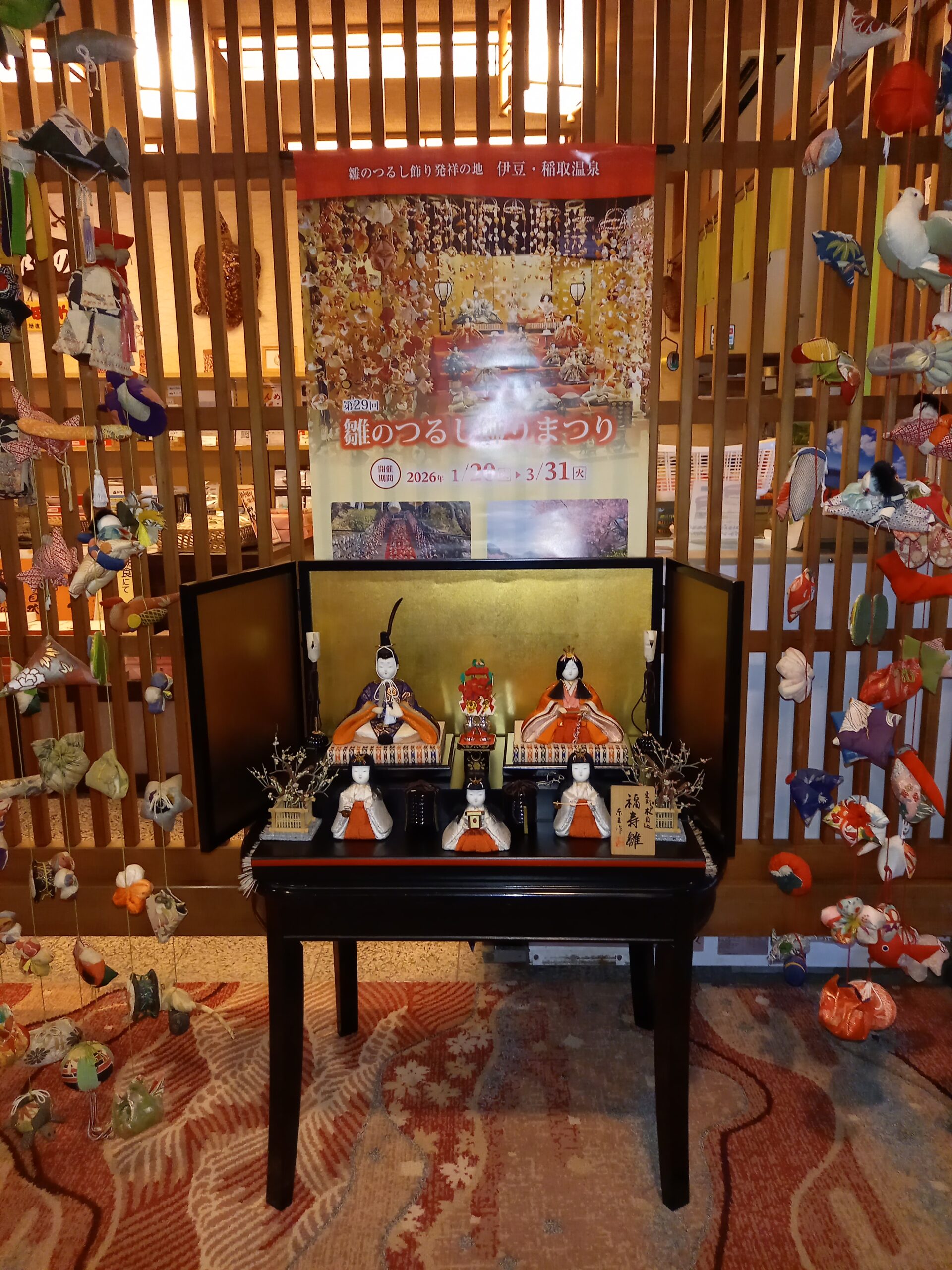 2026.02.04 新着情報, スタッフブログ ひな人形を出しました! 立春ということで、当館でも売店前にひな人形を出しました。吊るしびな飾りと共に、華やかになりました。 ホテル山田屋 フロント 茂木